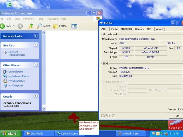 | dynamite,man911 wrote: | | at the blue bar were internet connection is surpose to be located there should be 2 computers with a red x over it. Double click it. Then go to create a new network.. then you figure it out. |