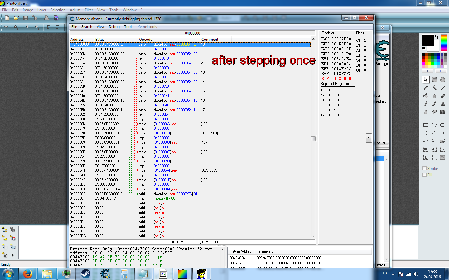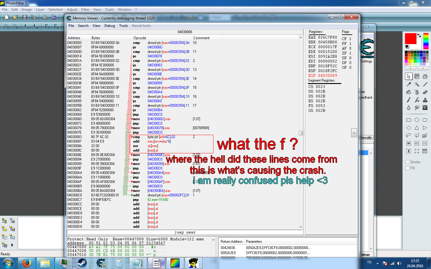 Now just look at what this does. Specifically the line mov [player4],edx. player4 is defined to be the address where that code starts. If you store edx into the address of player4, then your code will modify itself, resulting in the garbage you see in the disassembler. |